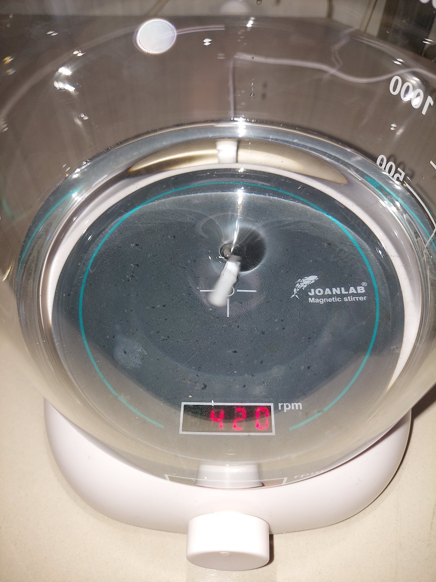 Desigur, vasul respectiv a fost pregatit pentru o ilustrare, pentru a putea observa frecventa de rotatie a magnetului si a lichidului (desi aceasta este valabila doar in imediata vecinatate a rotorului). In practica, prepararea se realizeaza in ... dispozitive mai mari ca volum, precum reactorul de preparare din fotografia din dreapta, in care se realizeaza si concentrarea sub vid avansat, daca este necesar.