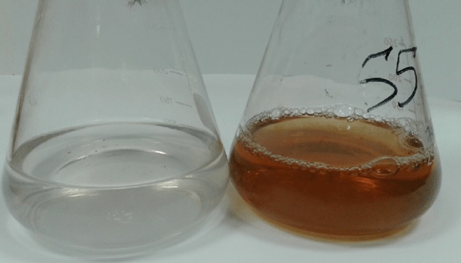 În vasul din dreapta, prin procese specifice, ionii de argint au fost transformați în nanoparticule de argint,